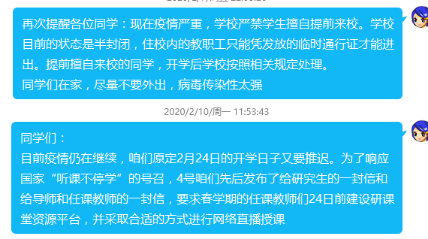 疫情就是命令,防控就是责任,学院高度重视疫情防控。在学院班子指导下,研究生管理办公室搭建起包括研究生导师、研究生管理人员和辅导员队伍在内的多层次、一体化疫情防控平台。通过发布“给导师的一封信”、“给研究生的一封信”,以及研究生院相关制度要求,确保研究生导师切实准确掌握学生动态、做好纪律要求和监督防控;通过“研究生对应疫情情况统计表”、“关于开展延迟开学期间研究生教育教学有关情况摸底”、“重点关注研究生情况备案表”、“研究生工作进展情况统计表”等等一系列细致工作,做到学生精准排查、疫情动态上报,为精准施策和防控措施提供支撑。同时,研究生管理办公室陈玉霞老师开拓畅通咨询渠道,加强人文关怀和心理疏导,及时解答研究生学习生活各项问题,通过学院微信公众号,学院网站和研究生QQ群、微信群及时发布学校关于疫情防控的重要通知、通告,引导全体研究生响应号召,科学面对疫情,做好自我防护。