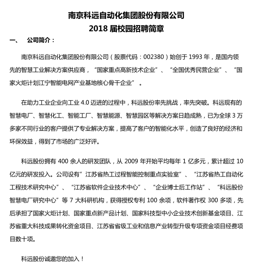 南京科远自动化集团股份有限公司 2019届校园招聘简章 一、 公司简介 南京科远自动化集团股份有限公司(股票代码:002380)始创于1993年,是国内领先的智慧工业解决方案供应商,公司秉承“让工业充满智慧、让智慧创造价值”的创新理念,致力于帮助企业实现生产过程自动化与信息化。以领先的工业自动化和信息化技术、产品与服务,保障企业的高效运营。积极践行工业4.0、“中国制造2025”等创新理念,推出“智慧电厂”、”智慧化工”、“智慧冶金”、“智能工厂”、“智慧能源”等一系列智慧工业解决方案,成为智能制造的先驱者。 科远股份拥有400余人的研发团队,年均研发投入1亿元,公司设有“江苏省热工过程智能控制重点实验室”、“江苏省热工自动化工程技术研究中心”、“江苏省软件企业技术中心”、江苏省流程工业故障诊断与数据挖掘工程中心、“企业博士后工作站”、“科远股份智慧电厂研究中心”等平台,获得授权专利100余项,软件著作权200多项,承担过国家工业强基工程、国家火炬计划、国家电子倍增计划、国家重点新产品计划、国家科技型中小企业技术创新基金项目、江苏省重大科技成果转化资金项目、江苏省省级战略性新兴产业发展专项资金项目、江苏省省级工业和信息产业转型升级专项资金项目等数十项国家、省部级科技项目。 科远股份诚邀您的加入! 二、 招聘职位及招聘要求 岗位类别 岗位方向 专业/方向要求 工作地点 学历及人数 营销类 客户代表 自动化、电气自动化、热动、热控、测控等 南京、北京、重庆、太原、郑州、云南、贵州 本科20人 开发类 大数据分析 计算机、自动化等;工业大数据&工业互联网平台设计与开发 南京 硕士5人 本科8人 智慧电厂开发(电厂智能诊断、优化运行) 热能工程相关专业 南京 硕士5人 控制系统优化开发 控制工程与控制理论、热工自动化、热能与动力工程 南京 硕士6人 应用软件开发(Java、C++、.NET) 软件工程、信息管理与信息系统、自动化、测控等 南京、武汉 硕士10人 本科20人 嵌入式软/硬件开发 自动化、电气自动化、测控、仪器仪表 南京 本科10人 电气开发 电气自动化 南京 硕士2人 技术类 自动化项目工程师 热能与动力工程、自动化、电气自动化、测控技术与仪器、机电一体化、液压与气动、化工、机械等 南京、成都、哈尔滨、济南、西安、宁夏、乌鲁木齐、石家庄、唐山、太原、武汉 本科50人 软件项目工程师 信息管理与信息系统、自动化、热能与动力工程、计算机、管理类 长春、沈阳、哈尔滨、武汉、西安、乌鲁木齐 本科30人 智能制造实施顾问 企业管理、工商管理、财务管理 南京 本科5人 电厂运行类 锅炉、汽机值班员 集控运行 徐州 大专5人 电气值班员 机电一体化、集控运行 大专4人 化水值班员 化学相关专业 大专4人 三、 福利待遇 (1) 工作时间:5天8小时工作制,提供员工宿舍及免费工作餐; (2) 有竞争力的薪资政策,激励性的奖金制度,前三年可根据能力提升快速加薪; (3) 高潜质员工最高可享30W免息购房借款; (4) 工作满2年可竞选“科远未来之星”,竞选通过,最高奖励30W安家费; (5) 五险一金及商业保险; (6) 连续五年可享南京市“人才安居”补贴; (7) 免费的员工旅游、年度健康体检、部门活动经费; (8) 结婚礼金、生子礼金、重要节日礼品、其他慰问金; (9) 丰富多彩的文体活动及文体赛事。 四、 简历投递方式 简历投递邮箱:hr@sciyon.com (邮件主题/简历名称格式:岗位名称+意向工作地点+学校+专业+学历+姓名) 更多招聘信息请咨询:025-69836011/69836268 公司网址:http://www.sciyon.com 公司总部地址:南京市江宁开发区清水亭东路1266号 南京科远自动化集团股份有限公司人资部 2018年11月 |